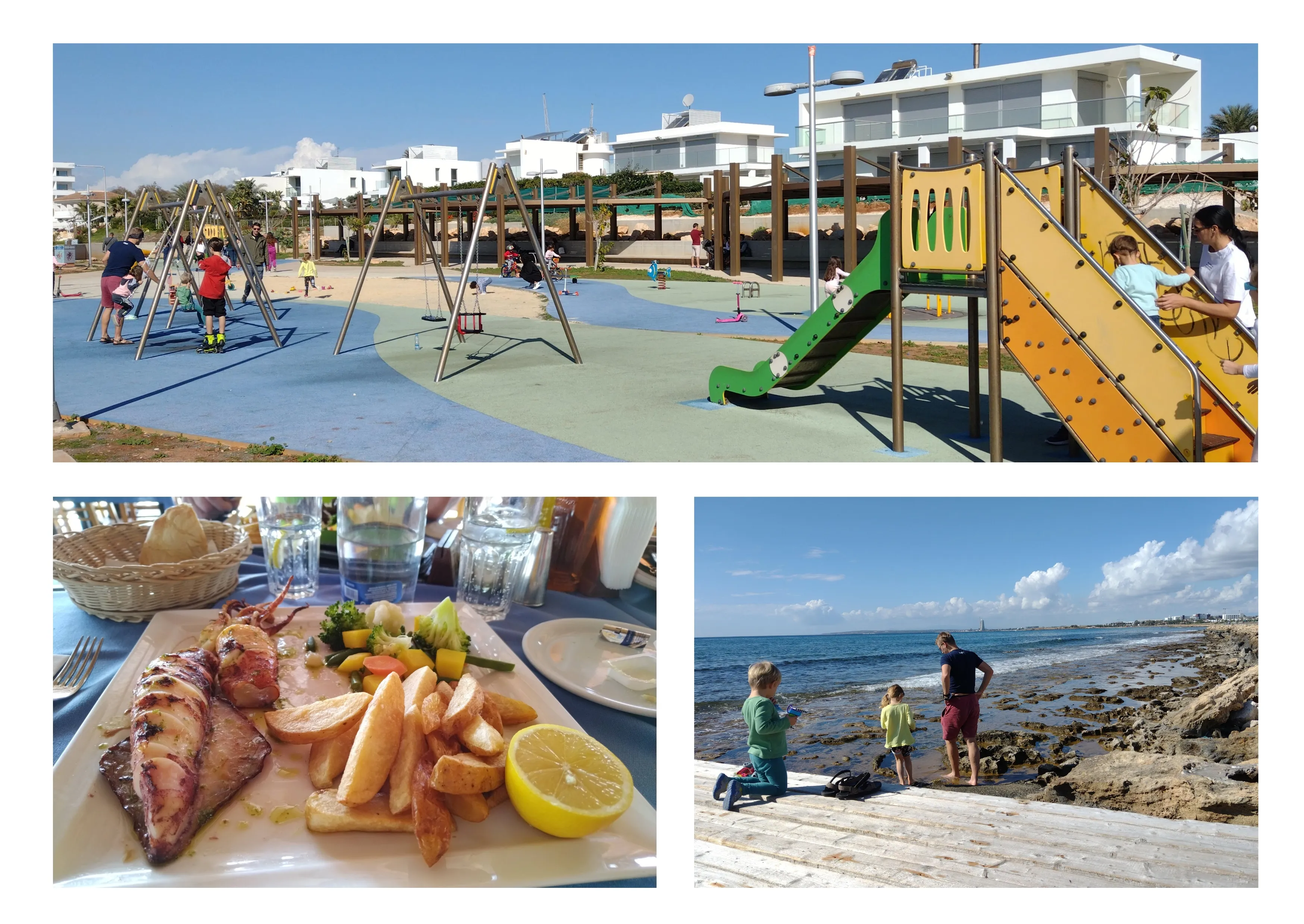 Menším dětem se bude zamlouvat hřiště u moře - Manti Beach park, kde najdou houpačky, kolotoč, klouzačky, písek a různé hupíky. Celé hřistě má tartanový povrch, tak se tu dá hezky padat a fajnově jezdit na odrážedle. V mezičase, kdy hlídáte dítka se můžete posadit na ochoz promenády a pozorovat moře. Až přijde hlad, snadno si odskočíte do nejbližší restaurace Iscaac taverna hned u parkoviště hřiště, kde vás skvěle nasytí. My si dali vynikající sépii na grilu. Vevnitř je malý koutek pro děti s plastovým domečkem.