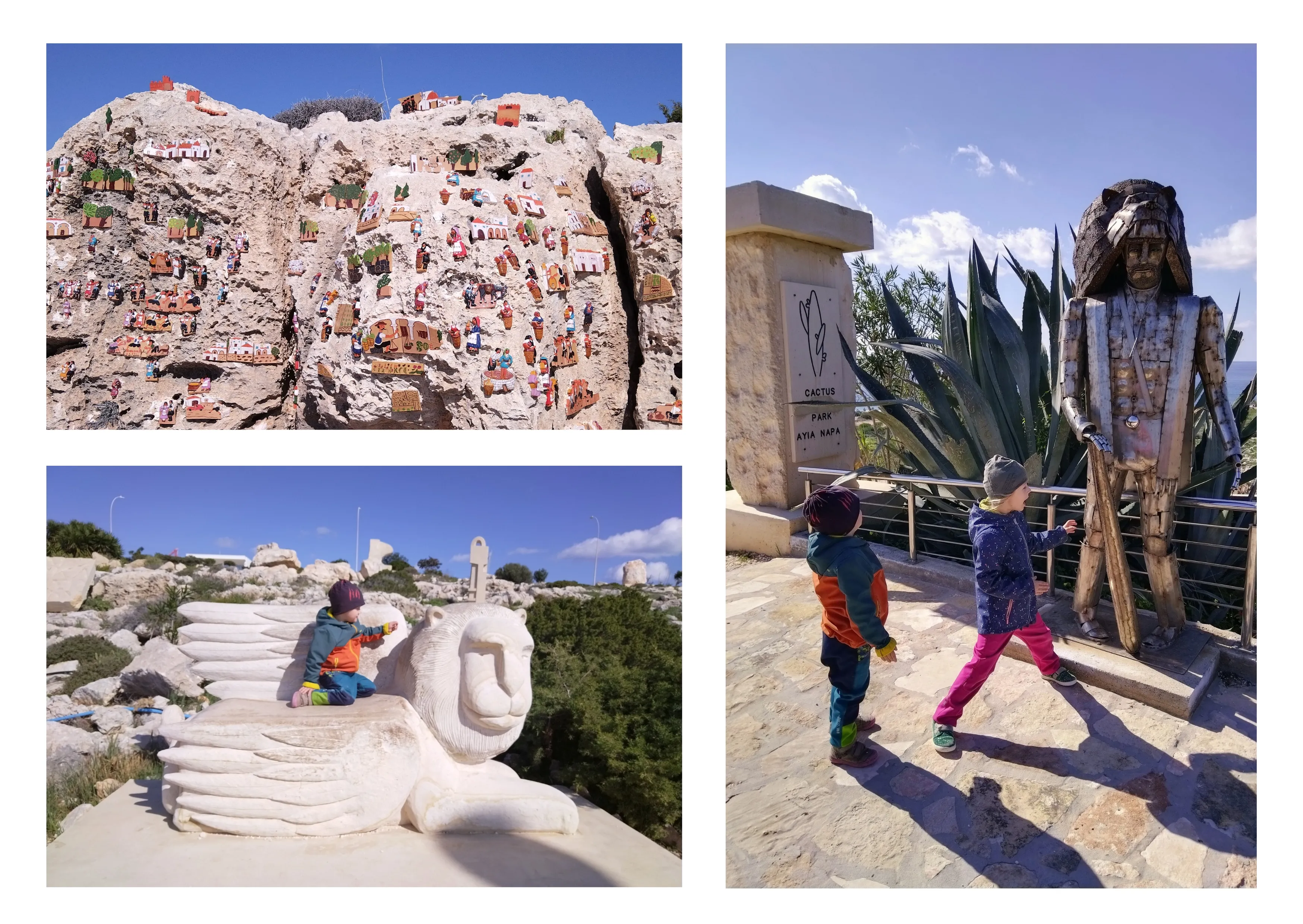 Začněte svoji dovolenou tady a nebudete litovat. Hezkých aktivit je tu tak na týden a to jsme zdaleka neobjevili všechno. Nejpůsobivějším místem je rozhodně místní park plný kamenných soch - Ayia Napa Sculpture park na východním okraji městečka. Jde o galerii pod širým nebem se vstupem zdarma po celý rok. Sochy jsou volně rozmístěny ve svahu a po písečných pěšinkách se dá procházet tam a zase zpátky. Naše děti tu běhaly, všude lezly a se zájmem objevovaly další a další kamenné i železné plastiky i to z jaké země je daný umělec. Pro dospělé je to ideální místo pro klidnou procházku a pohlazení po duši, kde se navíc nemusíte bát, že se vám děti zaběhnou.